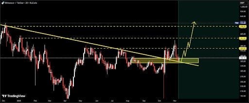Crypto analyst DeepFuckingValue (τ, τ) recently noted that TAO broke above a long-term descending trendline, often seen as a bullish reversal signal. The asset is now testing the $355–$386 range, described as a “battle zone between conviction and hesitation.”