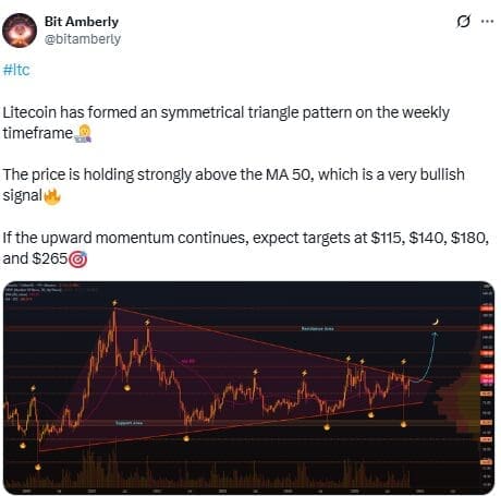 Bit Amberly, a top analyst on X, shares a similar sentiment. After identifying a symmetrical triangle pattern on the weekly timeframe, they believe the Litecoin price is on track to reach $115, $140, $180 and finally $265 if upward momentum continues. Based on this forecast, LTC is one of the altcoins to buy this cycle, especially if there is an altseason.