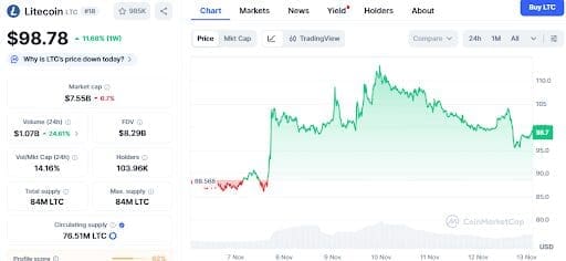 The Litecoin price is in an uptrend. On its 7-day chart, the altcoin price has increased by over 10%, outperforming most top cryptocurrencies. The recent launch of an ETF  can be linked to its remarkable performance, positioning it among the most promising altcoins to buy in November.