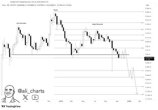 PEPE has exhibited a typical head-and-shoulder pattern on the altcoin front, suggesting a possible bearish turnaround. This structure was pointed out by crypto analyst Ali Martinez, who forecasts a target price of approximately $0.00000185.