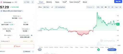UNI is considered a ‘safe bet’ after gaining over 18% in the past month as the rest of the market trended lower. However, its upside potential is limited in the near term, and experts believe it lacks momentum to deliver 100x returns.