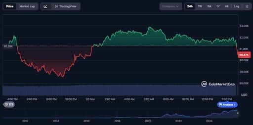 Recent figures show Bitcoin drifting dangerously close to the $90,000 threshold after previously reclaiming $120,000 earlier in the year. The past 24 hours alone saw BTC bounce between roughly $88,500 and $93,000, the kind of range that sends Bitcoin price prediction models into short-term chaos.