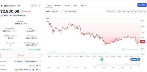 The price of Ethereum is currently on a downward trend, with $2,800 serving as a major resistance. According to CoinMarketCap data, the ETH price has dropped below this point a few times over the last week.
