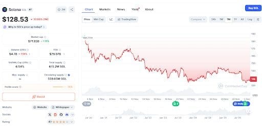 CoinMarketCap data show that the Solana price has been experiencing a downtrend in the past week, declining by 30.86%. The trend is weak, and the sellers are dominating the market at the moment.
