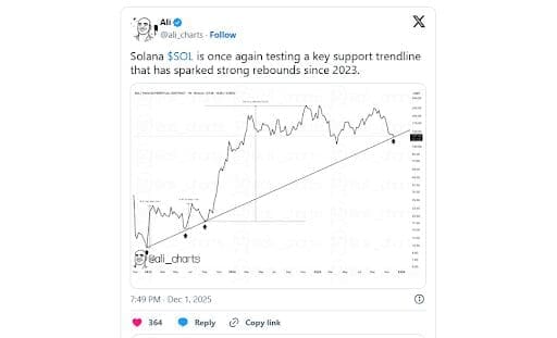 Yet, Ali_Charts, believes the SOL price could increase in the near future. He said that the altcoin is currently testing a major support trendline that has resulted in massive rebounds since 2023.