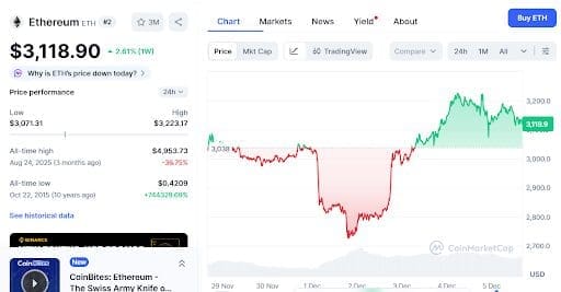 Bullish developments tend to push cryptocurrency prices higher. This can be seen in Ethereum (ETH), which reclaimed the $3,100 level after completing the much-anticipated Fusaka upgrade. While this is a laudable feat, Ethereum is still down 36% from its August 24, 2025, ATH.