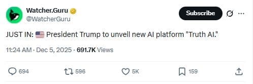 President Trump’s latest move is a new AI platform called “Truth AI.” While no details about the platform are available, it has arrived at the exact moment when crypto is fighting for direction. AI stocks have dominated the 2025 narrative, pulling retail interest and flows away from crypto.