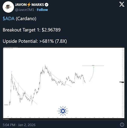 Influencer Javon Marks thinks this uptrend will continue for the Cardano coin. In a recent post, Javon told his X followers that this altcoin is now preparing for a massive upside move. He predicts a potential breakout to the $2.96 level coming soon for the ADA price.