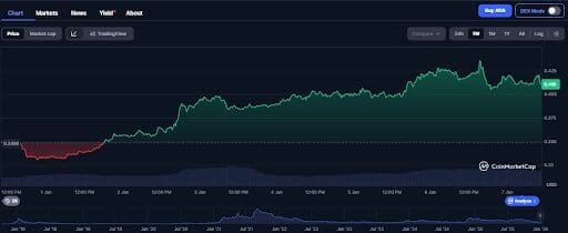 Cardano is another crypto coin that has managed to rebound after dipping at the end of 2025. On the one-week chart, the ADA price grew from around $0.35 to nearly $0.42 as per CoinMarketCap. This is nearly a 20% increase for Cardano in just a few days.