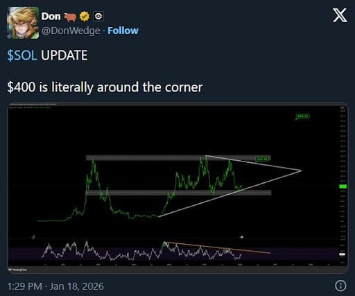 Some traders are still optimistic thanks to a bold Solana price prediction from influencer Don. In a recent post, Don told his X community that this crypto coin is consolidating in a tightening range. A bullish breakout scenario may lead to the price of SOL potentially rising to $400, as per Don.