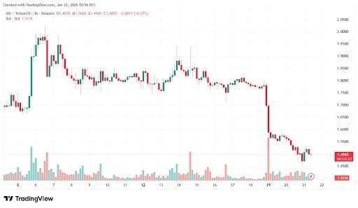 The chart paints a less optimistic picture. SUI topped near $1.95 and has since formed lower highs and lower lows. A high-volume breakdown from $1.75 confirmed the bearish trend. Support at $1.45 is under pressure. Lose that support, and $1.30 or below comes into play. The setup looks bearish, and most traders are keeping their distance.