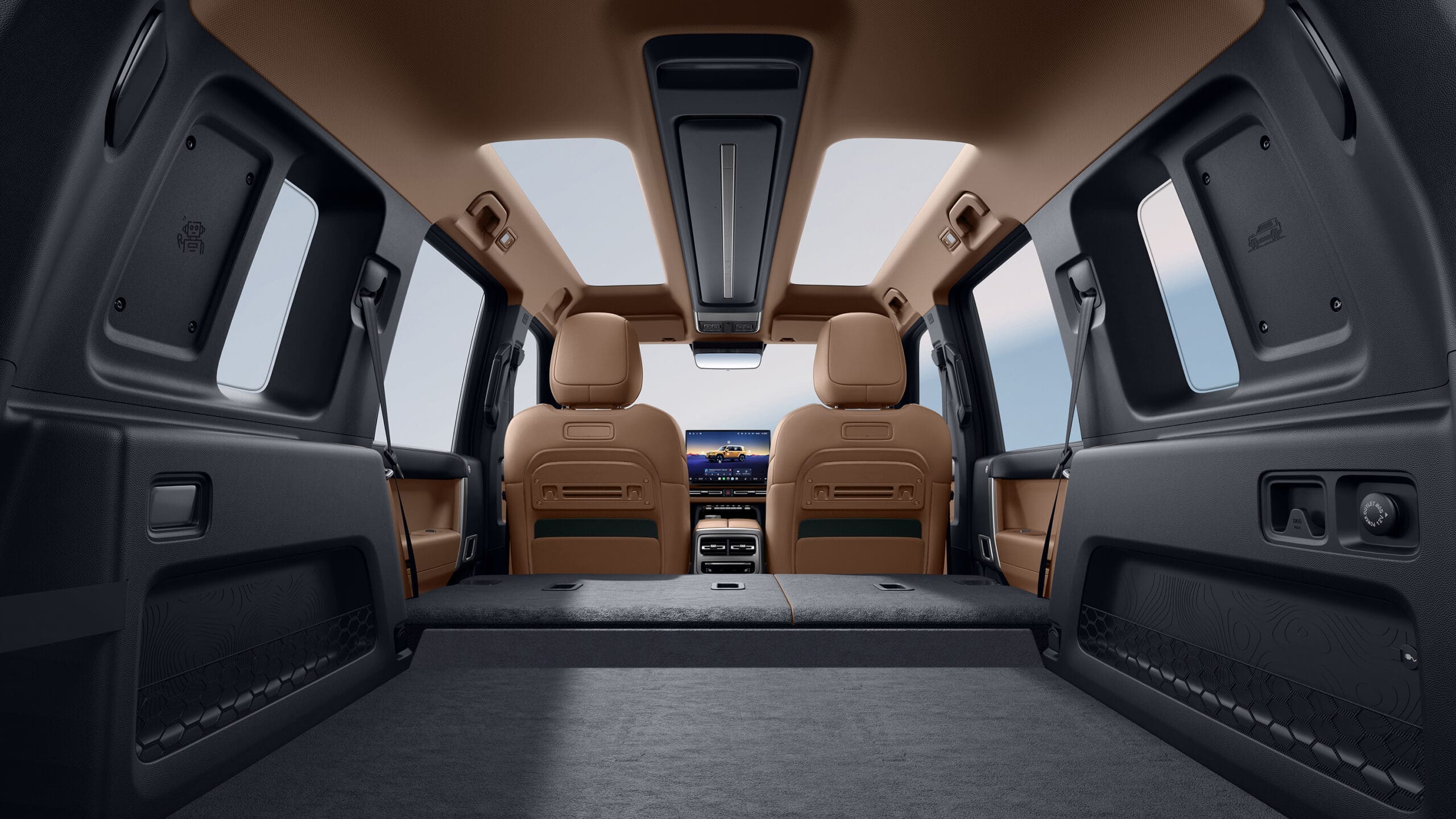 The V27’s interior engages all the senses. The floating “Star Island” ceiling, ambient lighting, and dual panoramic sunroof create a sense of spaciousness and interstellar wonder at night. The 15-speaker audio system, temperature-controlled armrest, and fragrance box elevate the ambience, while the cabin’s quiet NVH performance ensures relaxation on short breaks or during camping trips.