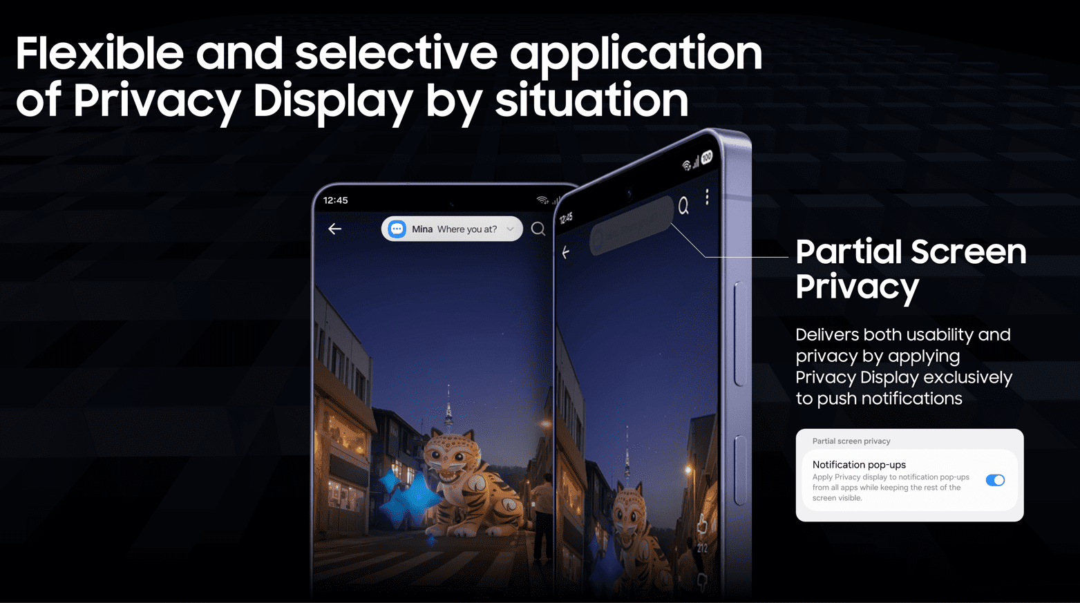 Privacy Display works hand-in-hand with Samsung’s software intelligence to give users complete control over when and how privacy protection activates.
